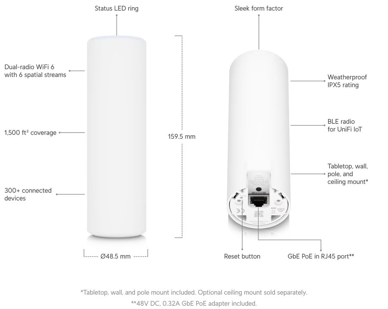 Vhodný pro vnitřní i venkovní použití díky IPX5 krytí. Bezproblémová integrace a správa pomocí síťového řešení UniFi. Součástí balení jsou držáky pro montáž na zeď, sloup a stůl.