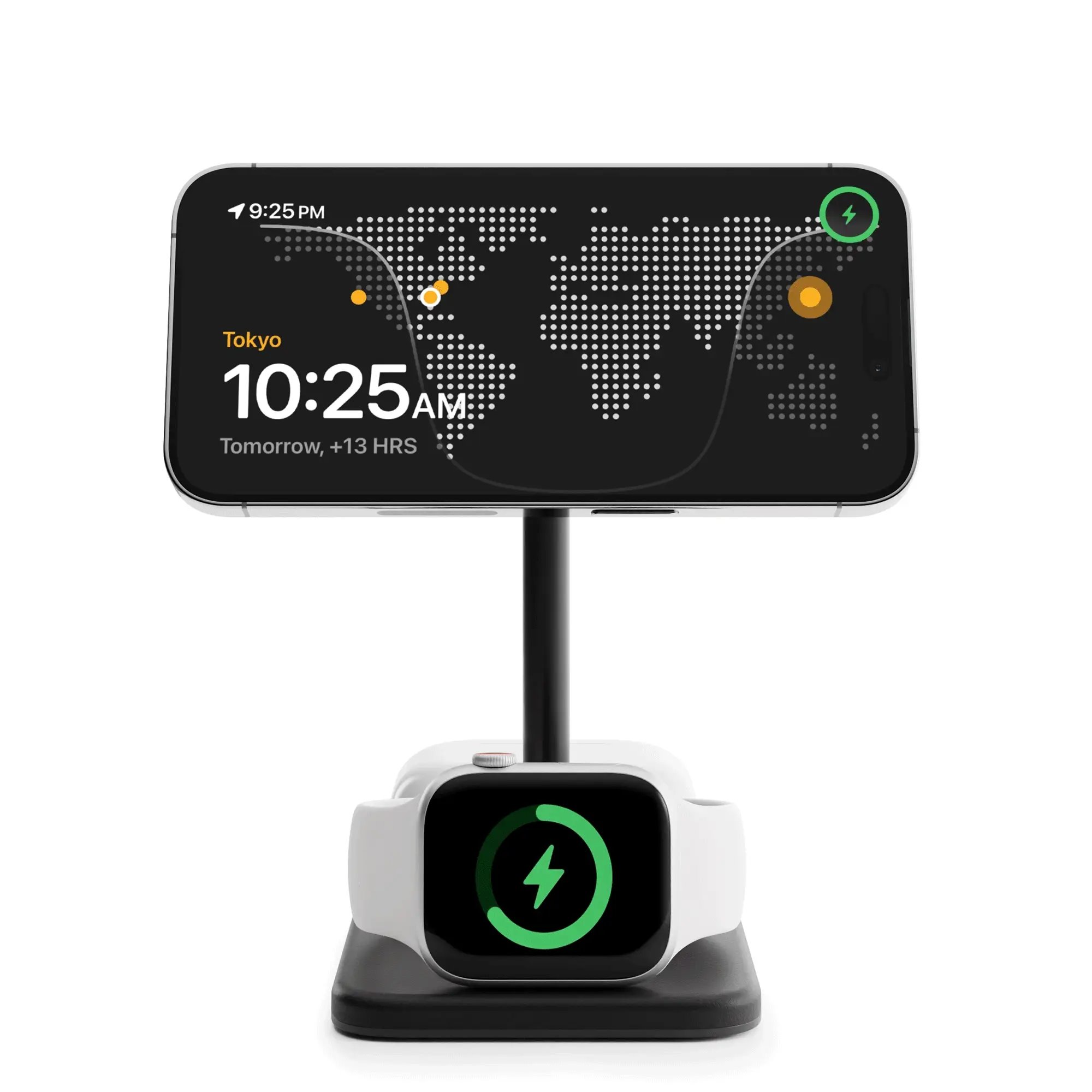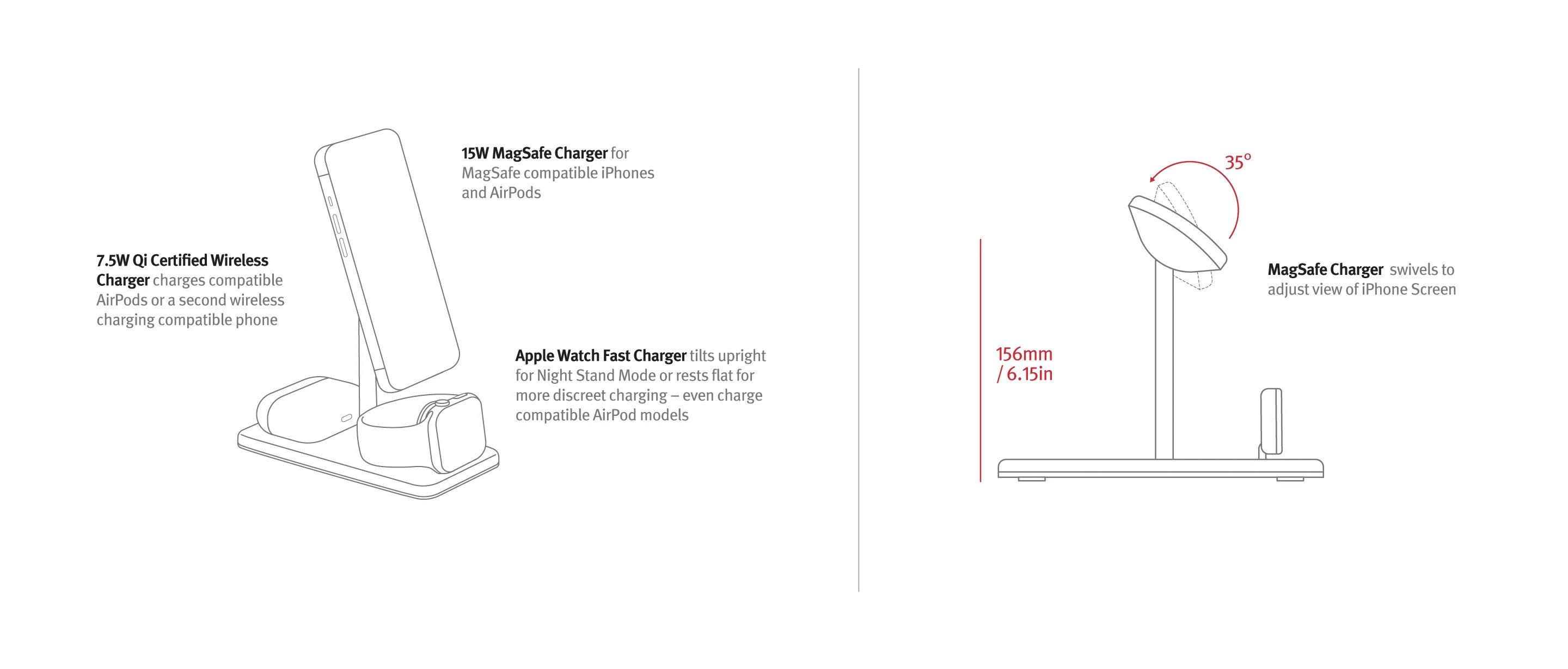 Celočerný stojánek byl promyšleně navržen tak, aby evokoval tichý luxus – od hliníkového sloupku až po podstavec obalený veganskou kůží. Nejrychlejší výkon zaručuje 15W nabíječka MagSafe pro iPhone a rychlonabíječka Apple Watch na palubě. Luxus, flexibilita a výkon - to vše v jednom kompaktním stojánku.
