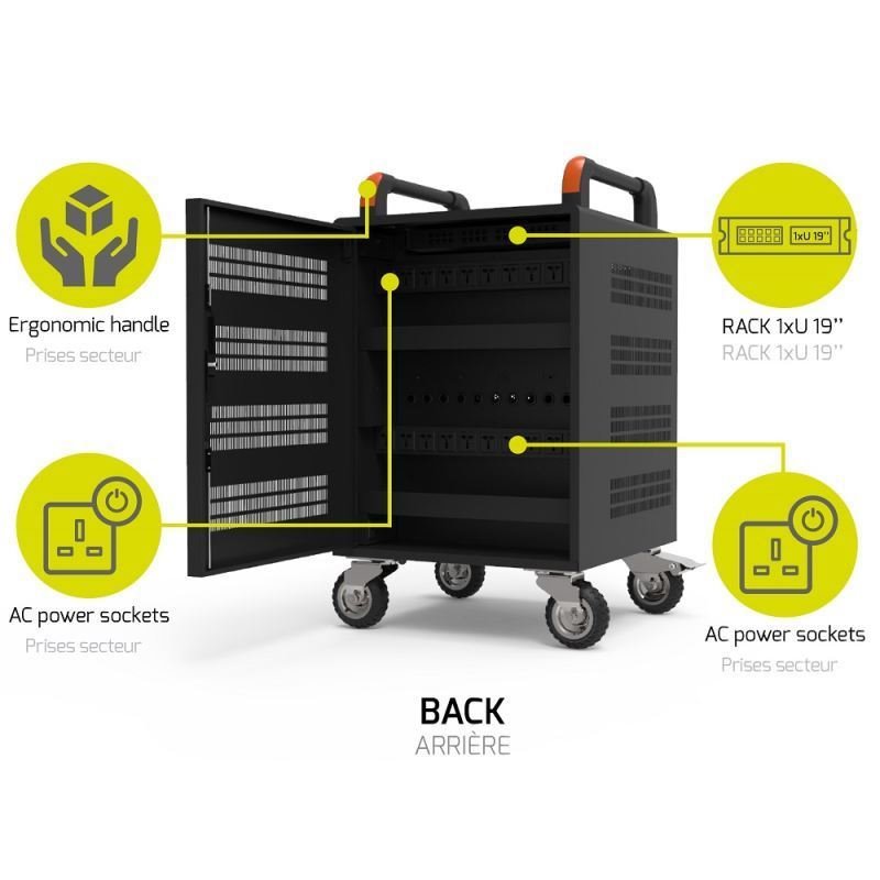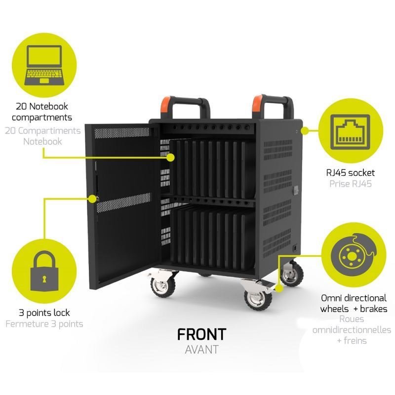 Originální napájecí vozík s funkcí dobíjení, kolečky pro transport a bezpečnostním zámkem pro 20 notebooků a 1x RACK U19"; Kapacita: až 20 notebooků do velikosti 15,6 '' a 1x RACK U19"; Maximální...