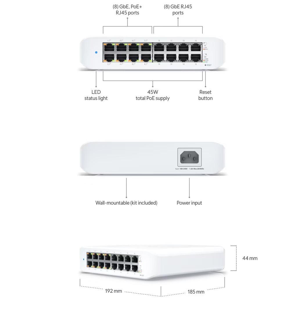 Ubiquiti UniFi Switch Lite 16 PoESwitch, 16× Gbit RJ45, 8× PoE 802.3at, 45W